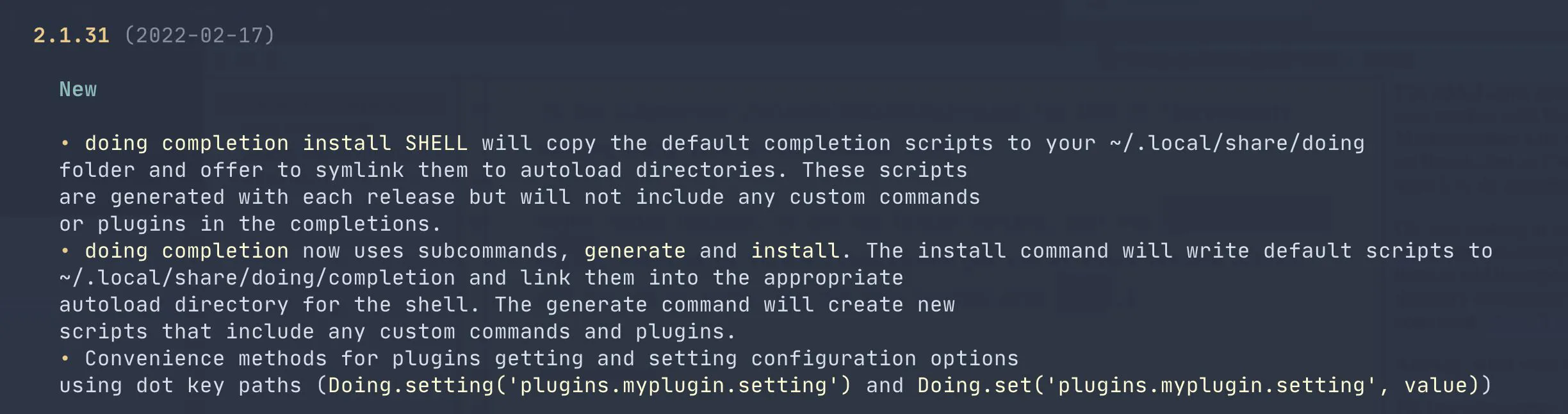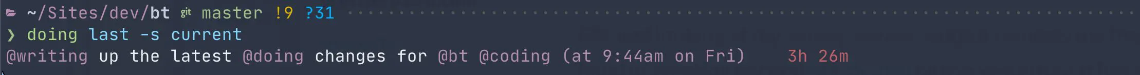 The shell completion scripts have improved, especially for Fish. (I put some more effort into Zsh, but I don’t use it regularly and I’m sure it could use further improvements. If you’re a Zsh pro and a Doing user, please feel free to create a GitHub Issue with any suggestions/fixes.)