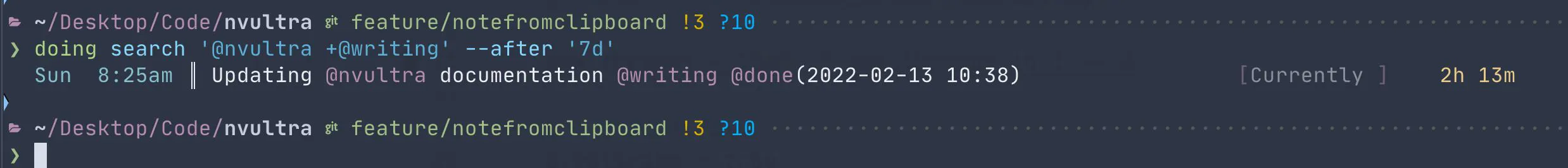 I’ve added some stuff to Doing lately. Like, a lot of stuff. To be fair, I’ve also done a lot of jobby job stuff. And worked with Fletcher on nvUltra. And started a rewrite of Gather as a menu bar clipboard web Markdownifier with integration with multiple apps (that one’s going to be cool if I finish it). And some time on Bunch. But as I’ve said before, the one thing I use when working on all of these is Doing. And I always want it to do something new or better, so it gets some attention.